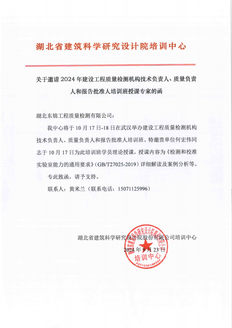 閱讀次數(shù):750 發(fā)布時間:2024年09月27日2024年9月23日,湖北省建筑科學(xué)研究設(shè)計院股份有限公司培訓(xùn)中心發(fā)函邀請公司總經(jīng)理何宏偉于10月17日-18日在武漢舉辦的建設(shè)工程質(zhì)量檢測機(jī)構(gòu)技術(shù)負(fù)責(zé)人、質(zhì)量負(fù)責(zé)人和報告批準(zhǔn)人培訓(xùn)班上授課。授課內(nèi)容為《檢測和校準(zhǔn)實驗室能力的通用要求》詳細(xì)解讀及案例分析。